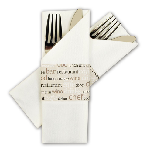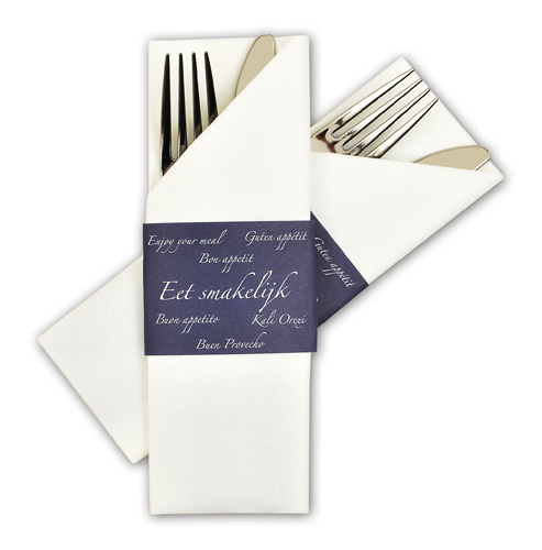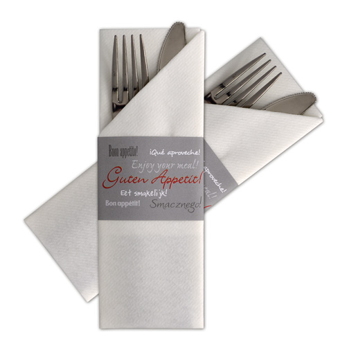 This luxurious white airlaid napkin measuring 40 x 40 cm is ingeniously folded by us into a cutlery bag.